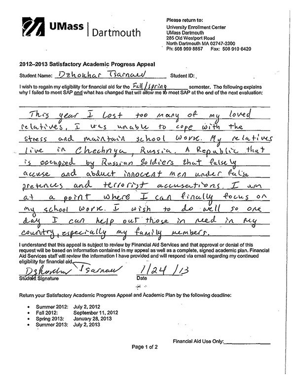 15. For anyone here wishing to help Dzhokhar in a tangible way, here is a petition to the US Attorney General, asking for the SAM’s to be modified to allow Dzhokhar’s extended relatives to write, visit or to speak to him by phone. I think this would be a comfort and also give Dzhokhar more to do, more to look forward to. He does have other relatives in the US who would possibly visit him. We have also seen how much his relatives overseas love him, and he certainly loves them to. It’s nothing but vengeance and cruelty to keep a prisoner from those who love him. I think we all know that Dzhokhar is no threat to anyone. Please sign the petition and share it far and wide. It may just work.