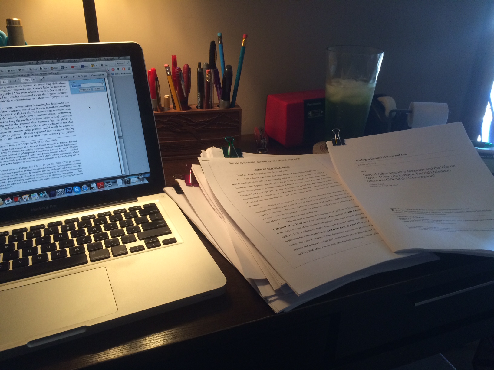 What my desk has looked like lately, featuring the legal documents from Dzhokhar’s case that Attorney Dad has graciously agreed to look over for me.