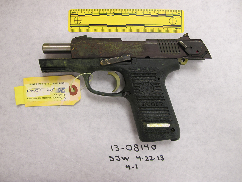 Regardless, he was killed by someone. The murder weapon was a Ruger P95 handgun with the serial number filed off, recovered from the shootout in Watertown, the gun that was in Tamerlan Tsarnaev’s possession. This was established at trial through testimony and Massachusetts State Police reports also match the ballistics from the Ruger to the bullets recovered from Collier’s body. There’s no doubt about it: this is the gun.
