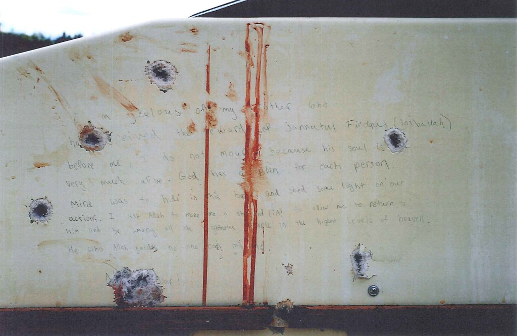 The note written on the walls of the boat by Jahar before his capture was one of the most damning pieces of evidence presented against him at trial. This is because it depicts, in his own handwriting, a confession to the crimes and an explanation of motive. However, that “motive” consists of the exact thing I’ve spent countless hours in my thesis calling out as inaccurate stereotypes: that his and Tamerlan’s acts of violence were done in pursuit of the glory of Paradise and in service of Allah, etcetera. So if it’s true that those notions are Orientalist nonsense, why would Jahar claim in his note to believe them?